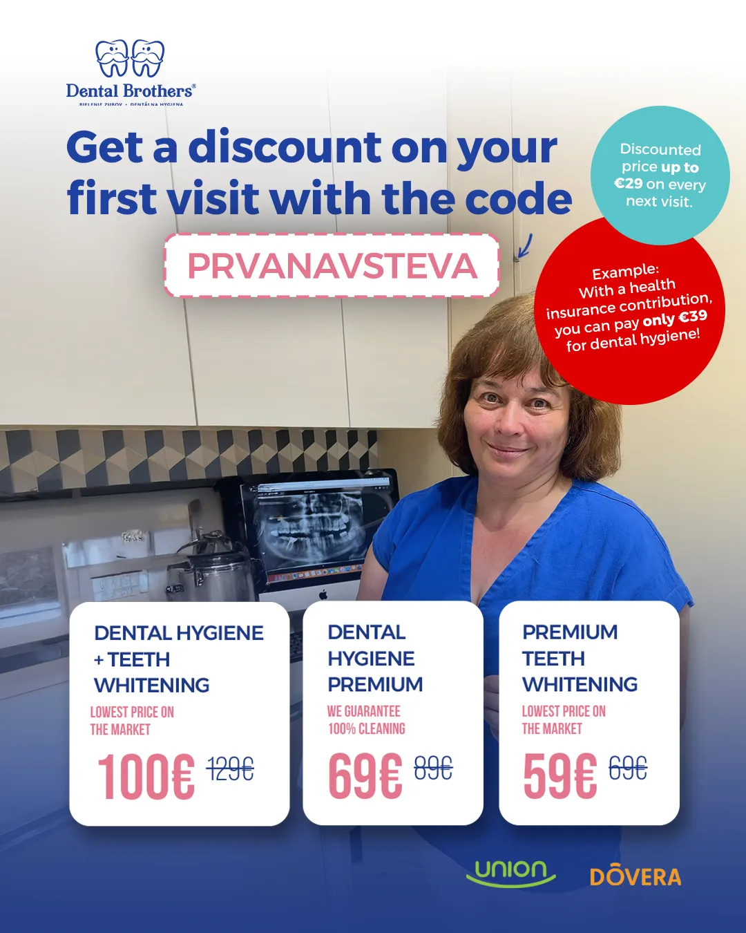 All Inclusive (dental hygiene + teeth whitening) for (€129) €100, dental hygiene for (€89) €69, and teeth whitening for (€69) €59 with the code PRVANAVSTEVA. In addition, you will receive a €20 discount on every additional dental hygiene treatment. With your health insurance contribution, you will pay only €39 for dental hygiene.